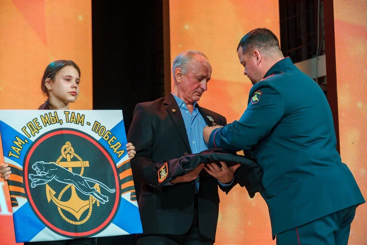 На сцене Международного молодежного военно-патриотического фестиваля «Димитриевская суббота» китель семье погибшего в зоне СВО военнослужащего Александра Нападова передал ветеран боевых действий, кавалер двух орденов Мужества, прапорщик Олег Бабаев.