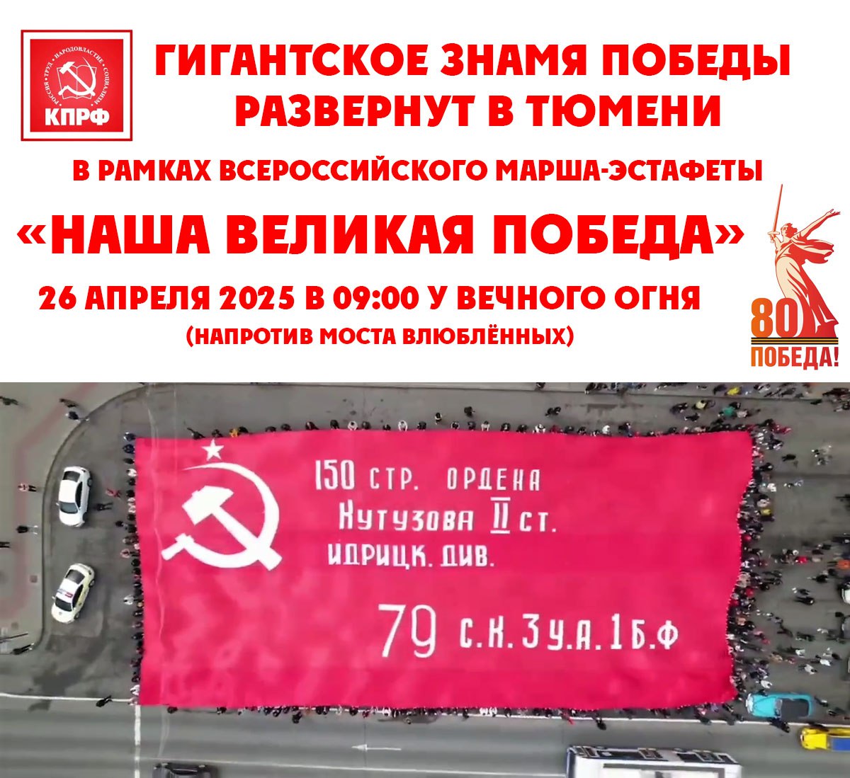 Акция пройдет в рамках Всероссийской марш-эстафеты «Наша Великая Победа», ее организует КПРФ. Тюмень получила право первой в Уральском федеральном округе провести эту акцию, сообщает региональный информационный центр.