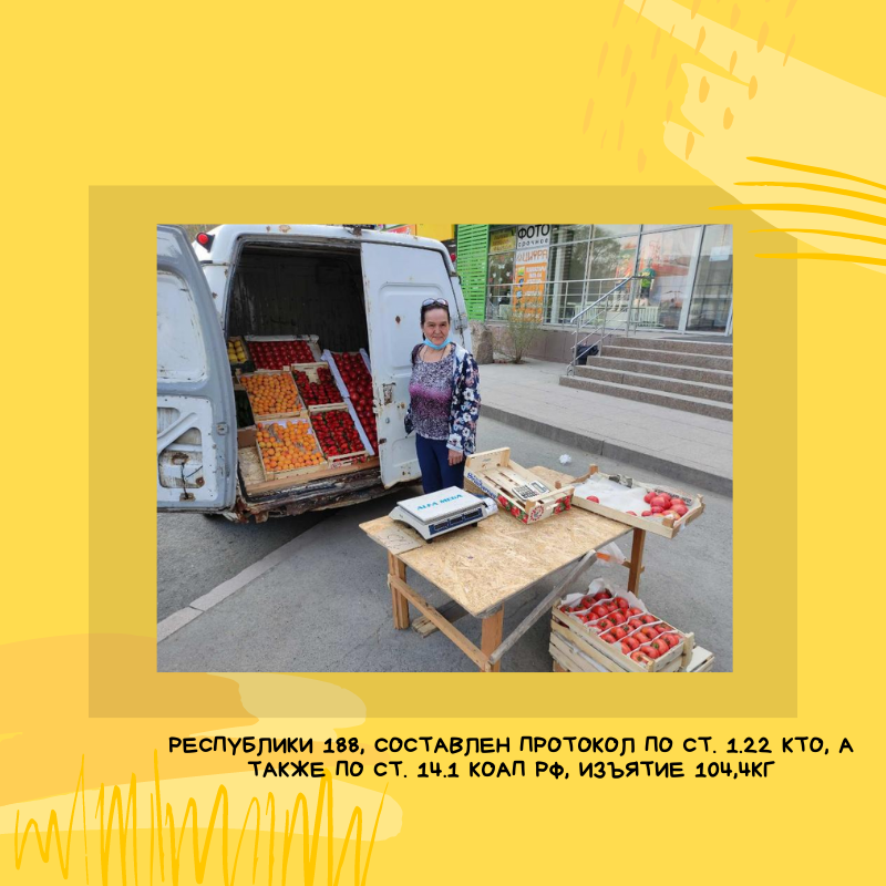 В ходе рейда 5 мая в Тюмени изъято более ста килограммов овощей и фруктов в местах стихийной торговли. В частности, три протокола выписано тем, кто торгует на ул. Мельникайте, 116, стр. 1, и на ул. Ямской, 98а. На нелегального продавца с ул. Республики, 188 составлен протокол по ст. 1.22 КТО, а также по ст. 14.1 КоАП РФ.