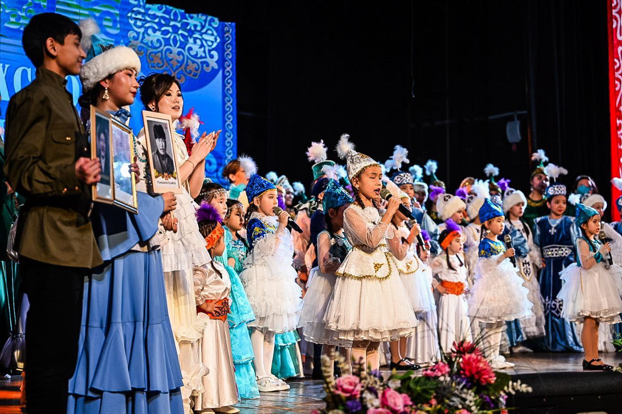 На праздничной площадке были размещены стенды, рассказывающие о жизни и подвиге Героя России, участника СВО Жумабая Раизова и вкладе казахского народа в Победу в Великой Отечественной войне.