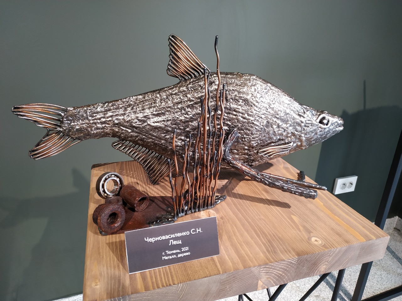 На открытии выставки много людей, наибольший интерес у посетителей вызывают завораживающие скульптуры из металла, созданные тюменцем Станиславом Черновасиленко и тоболяком Юрием Ларионовым. У Станислава коллекция биомеханических рыб, обитающих в Западной Сибири. Они созданы из сварных швов. Мастер постоянно привносит что-то новое. Рыб он ещё и «покрасил» огнем, придав им коричневый оттенок.