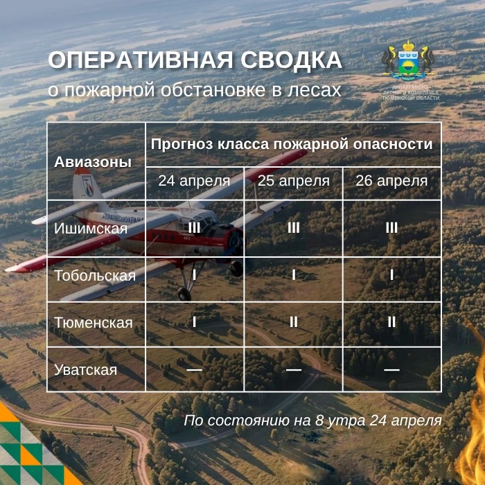 25 и 26 апреля в Ишимской авиазоне прогнозируется III класс пожарной опасности (средняя степень), в Тюменской — II класс (низкая степень), в Тобольской — I класс (опасности нет).