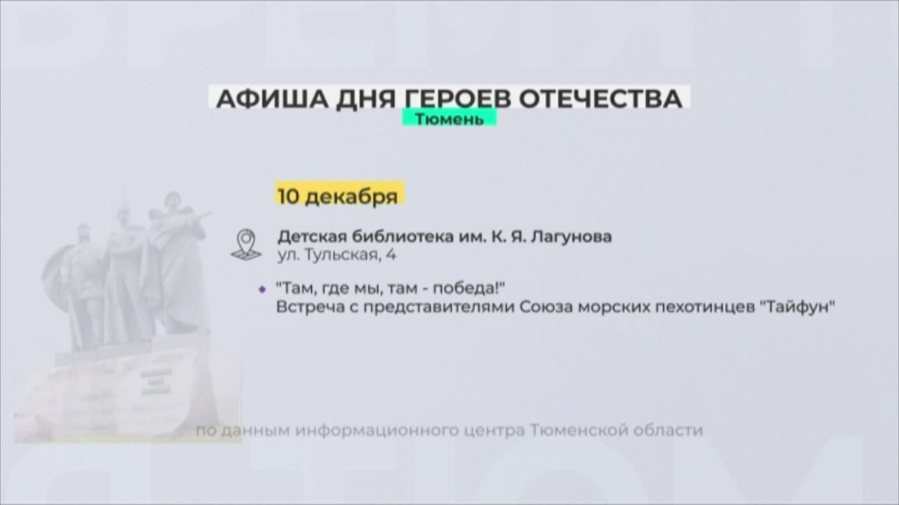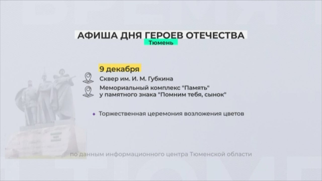 Тюменская область 9 декабря отмечает День героев Отечества. В регионе пройдут разнообразные мероприятия, приуроченные к этому событию, сообщает телеканал «Тюменское время».