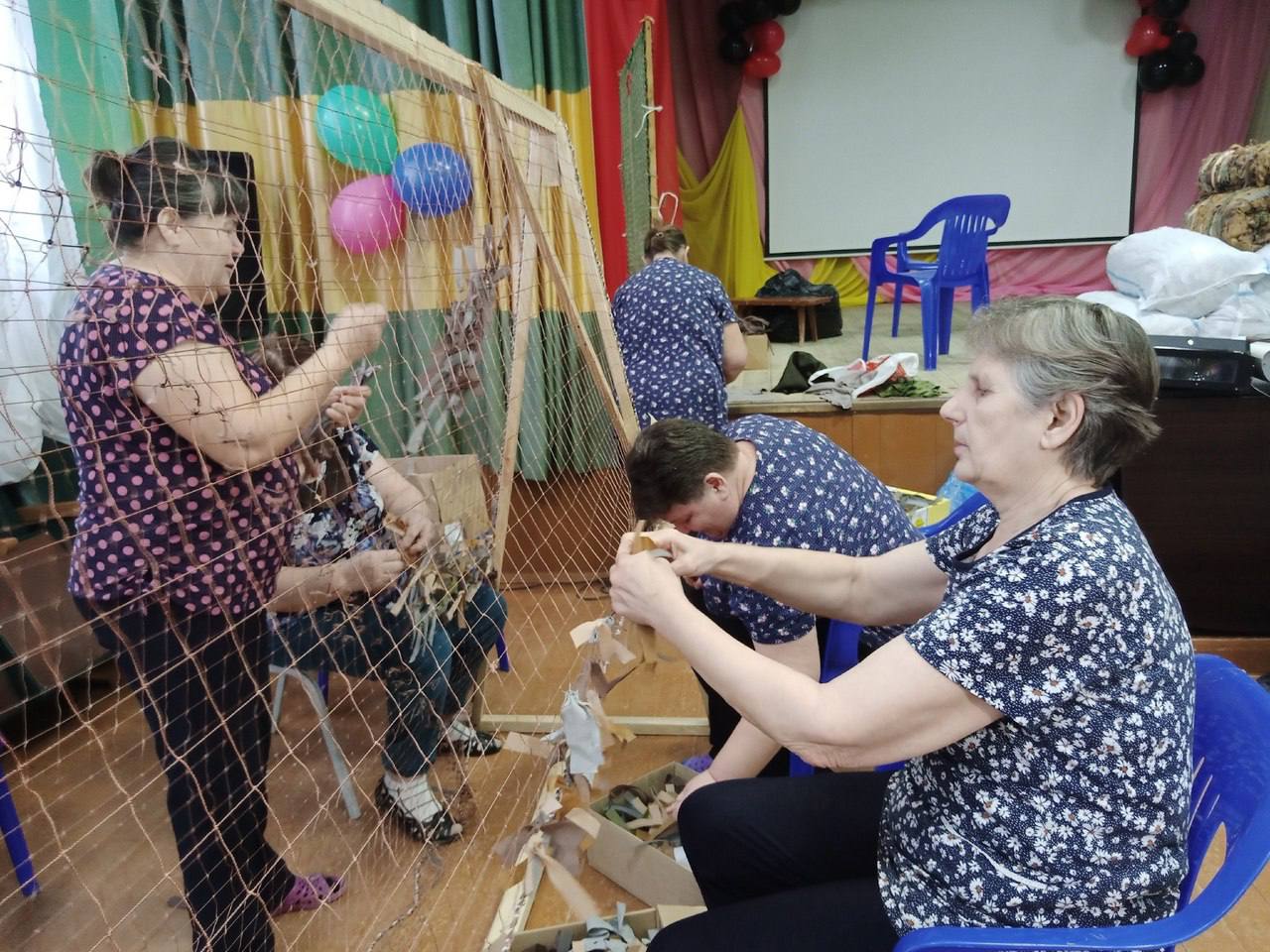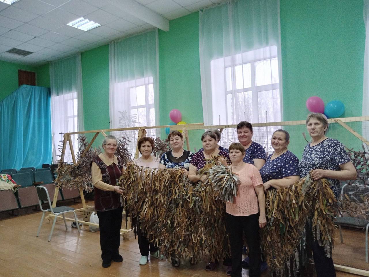 Жительницы села Сартам Викуловского района ежедневно плетут маскировочные сети для бойцов на передовой. Им помогают мужчины-волонтеры, которые изготавливают специальные приспособления для работы. Помимо сетей активисты изготавливают маскировочные костюмы с нашлемниками.