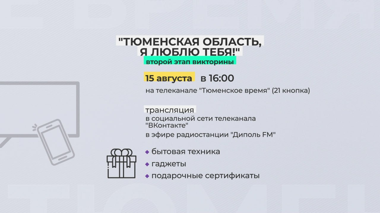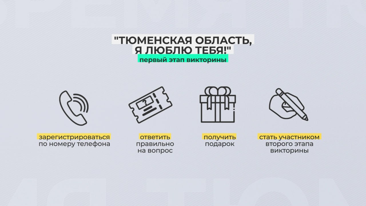 В канун 80-летия региона жители смогут принять участие в викторине «Тюменская область, я люблю тебя!». Она пройдет в два этапа. Следовательно, у участников дважды появится возможность получить подарки.