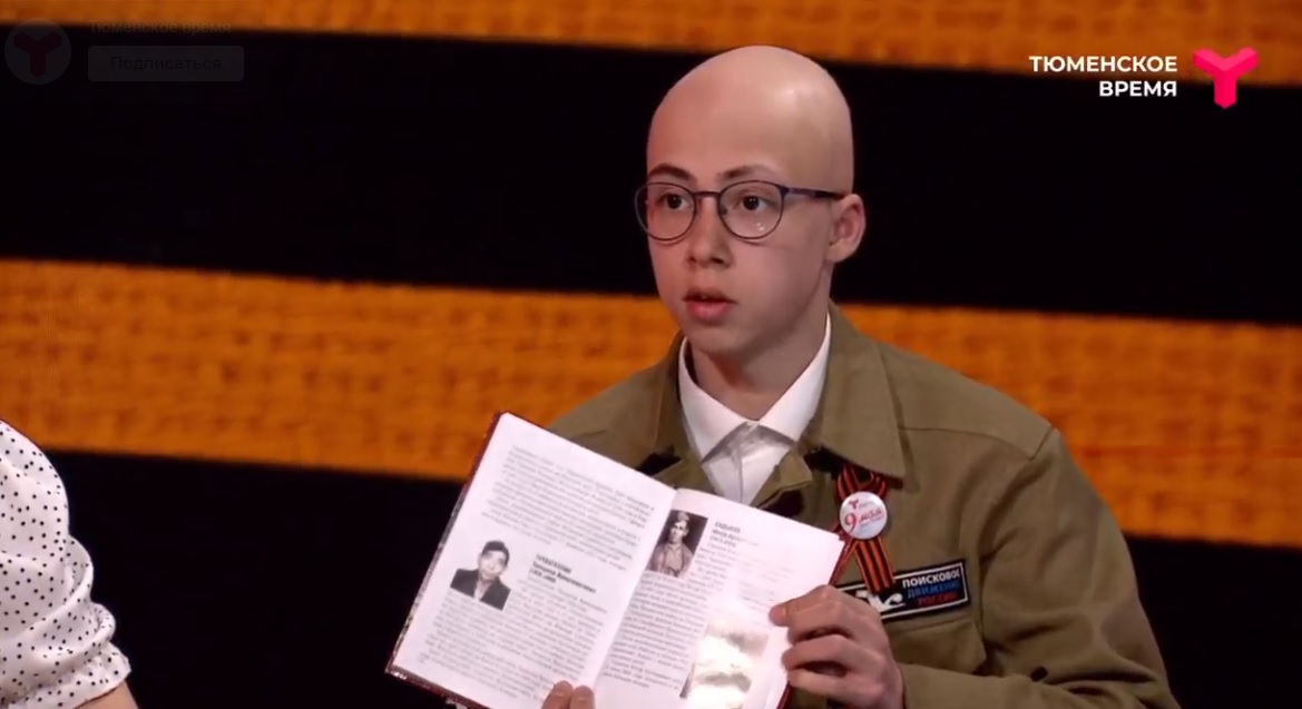 В весенней вахте памяти участие принял 15-летний тюменец, воспитанник поискового отряда «Пионер» Тимур Юмачиков. Он принес в студию потрет своего прадеда Юсуфа Садыкова, который прошел всю войну, закончил ее в Польше, награжден орденом Красной звезды, польским Крестом. Он обучал польских танкистов управлять танком Т-34.