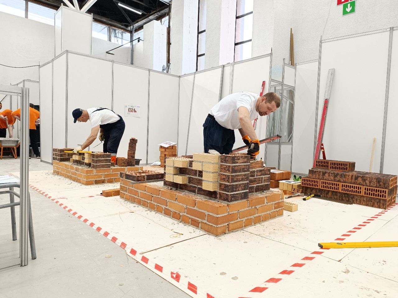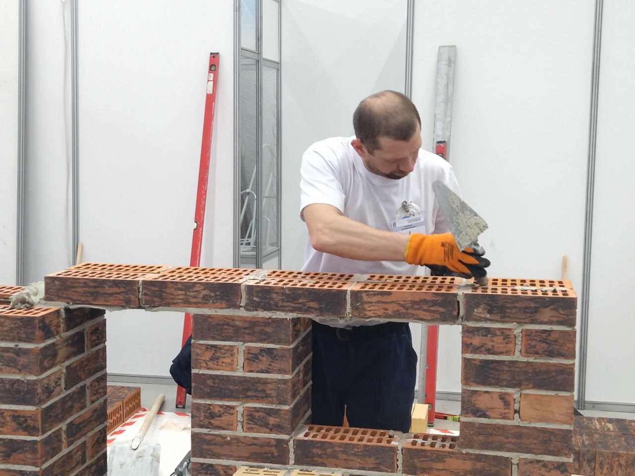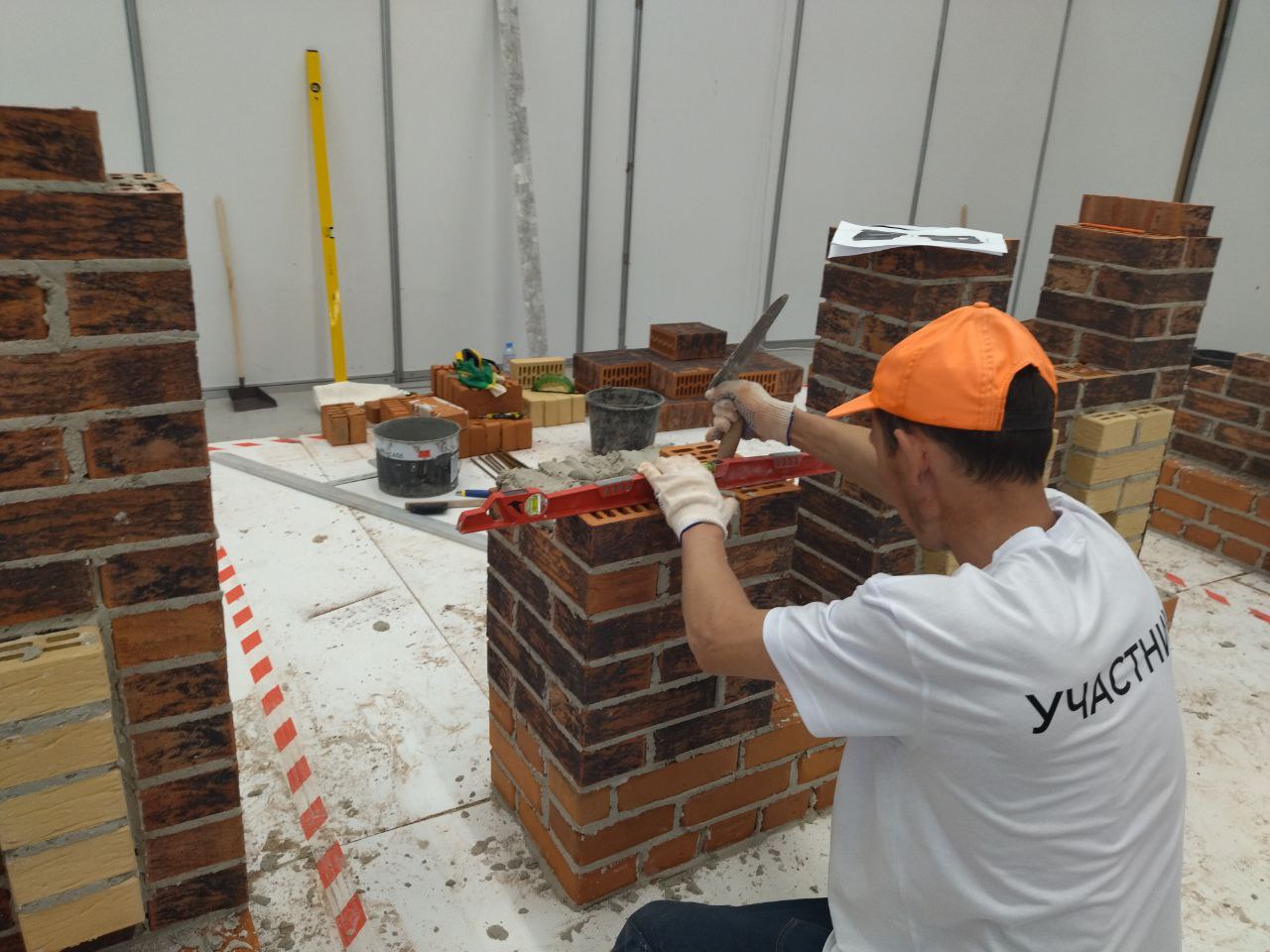 Конкурс проходит уже в 14-й раз, однако впервые именно в Выставочном зале. Ранее он проводился на объектах, в прошлом году — на базе профучилищ. Каждому из участников нужно за шесть часов уложить 240 кирпичей по заданному проекту. За работой каменщиков понаблюдал корреспондент «Вслух.ру».