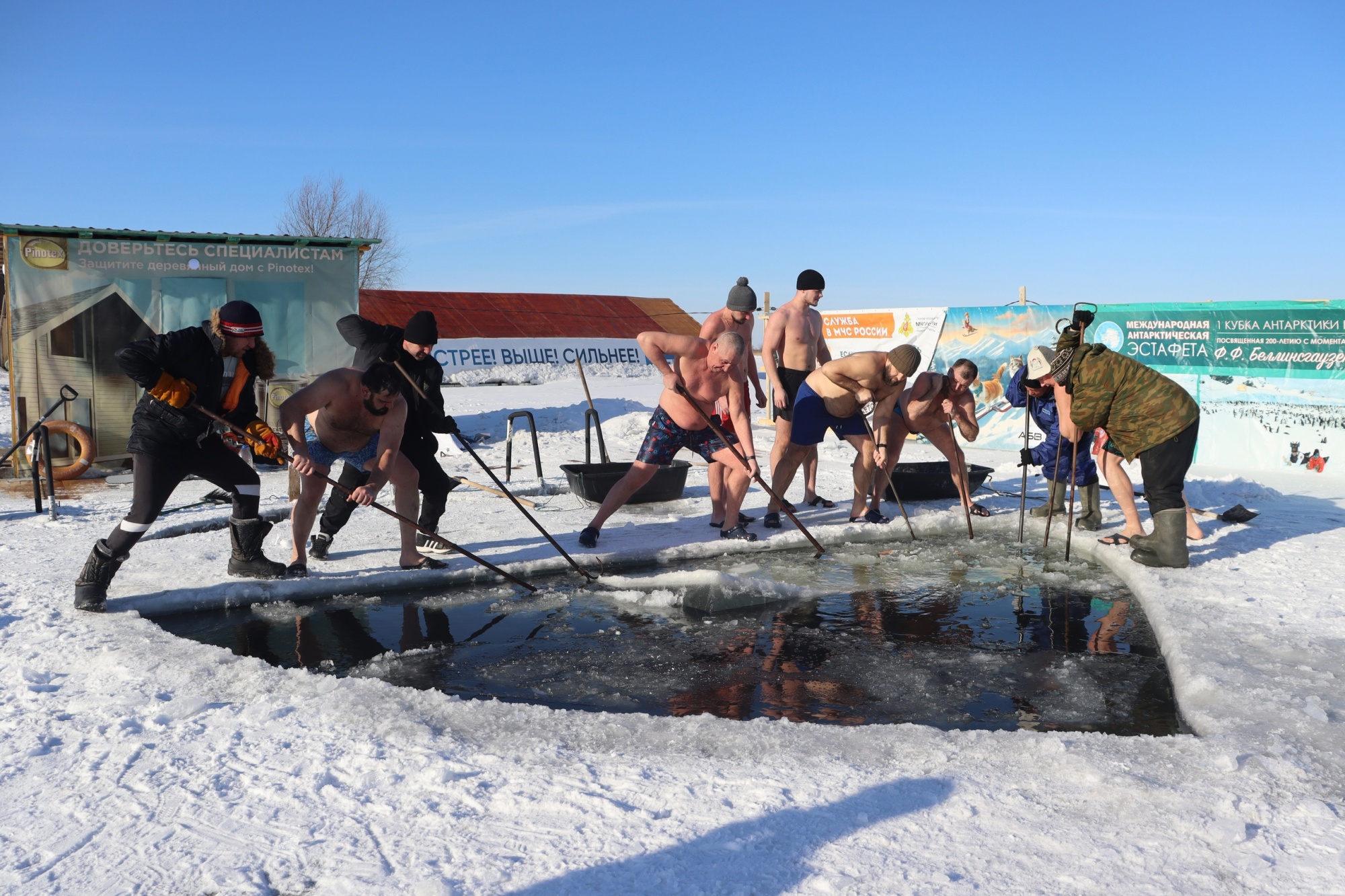 Сейчас, специально для турнира, изо льда строится большая чаша, ее заполнят водой из озера. Получится что-то вроде бассейна, в нем и пройдет блиц-турнир. Его участники имеют опыт закаливания и с удовольствием играют в шахматы.