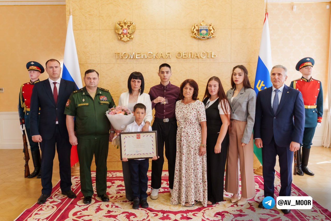 Сегодня в правительстве Тюменской области состоялась церемония вручения Золотой Звезды Героя России. Высшей государственной награды посмертно удостоен младший лейтенант Альберт Тян. Ее вручил семье военнослужащего губернатор Александр Моор вместе с врио командующего войсками Центрального военного округа генерал-лейтенантом Дмитрием Глушенковым.
