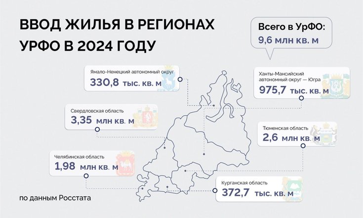 Росстат подвёл окончательные итоги по вводу жилья в регионах за 2024 год. Уральский федеральный округ завершил период с рекордными показателями: введено 9,6 млн кв. м жилья, это на 1,9% больше, чем в 2023 году, который также был рекордным по объёмам ввода.