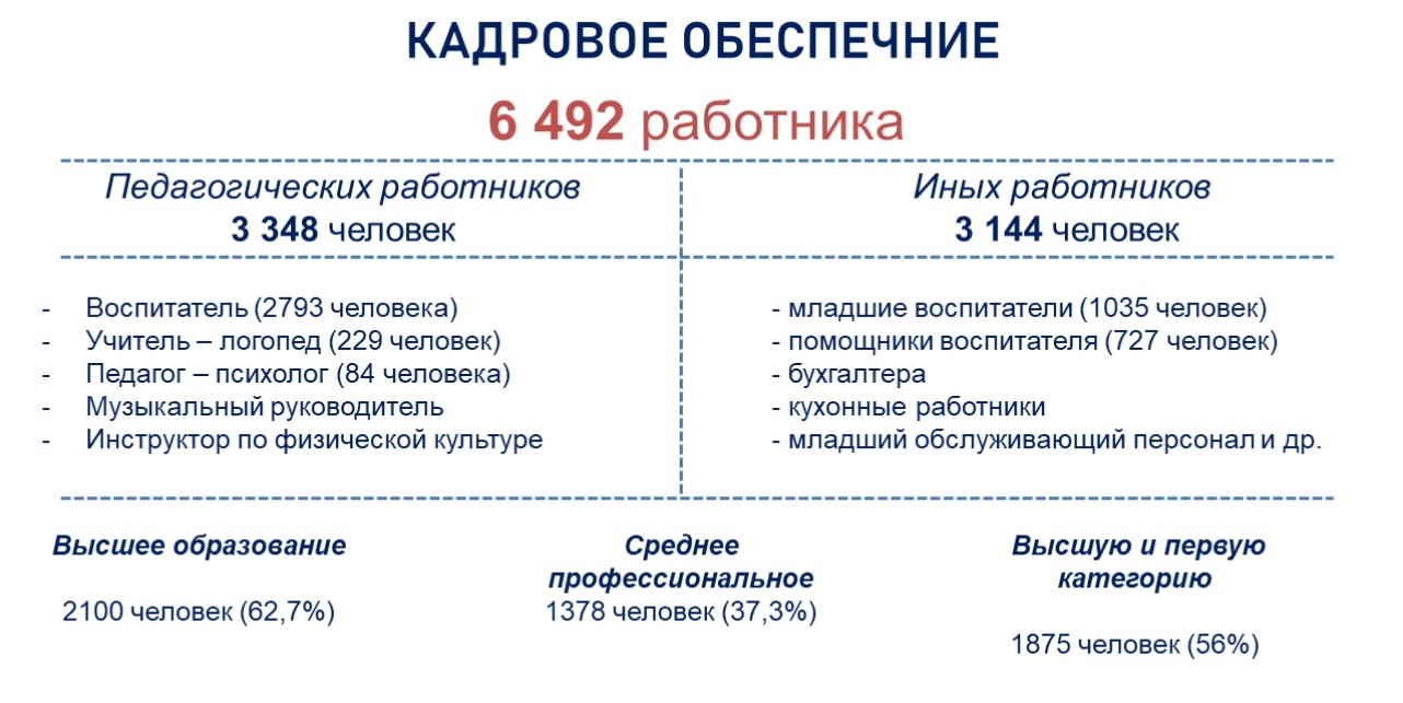 Из 3,3 тыс. педагогов у 2,1 тысячи есть высшее образование. В 58 учреждениях созданы консультационно-методические пункты для родителей и детей, которые не ходят в детсад.