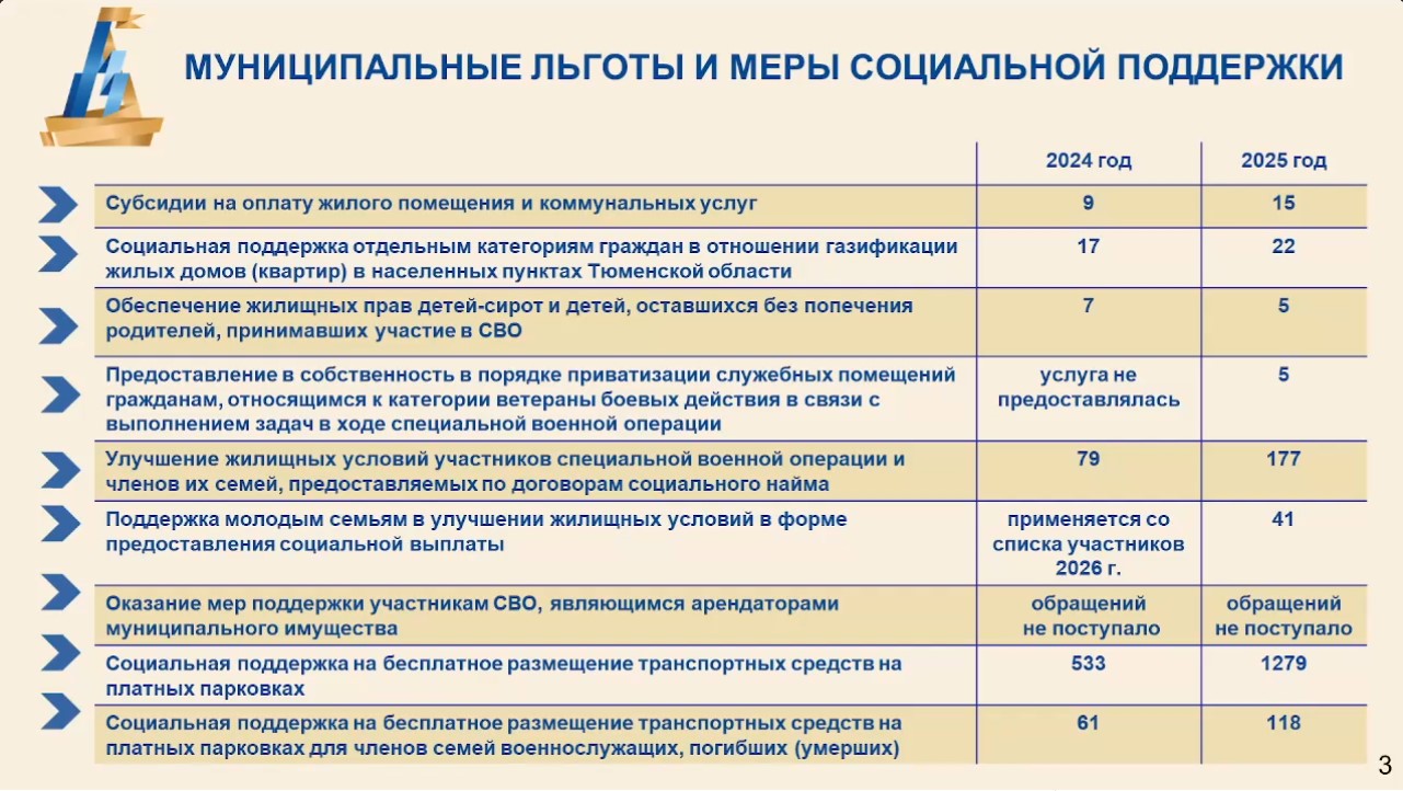 «Вопрос о мерах поддержки участникам СВО и их семьям действительно серьезный, актуальный и важный. В Тюмени проводится много комплексных, системных мероприятий. В частности, в 2025 году 177 семей получили жилье на условиях социального найма, — проинформировала председатель Тюменской городской думы Светлана Иванова. — Однако многие меры поддержки носят заявительный характер. Поэтому нам необходимо более активно вести разъяснительную работу, рассказывать о предоставляемых возможностях».