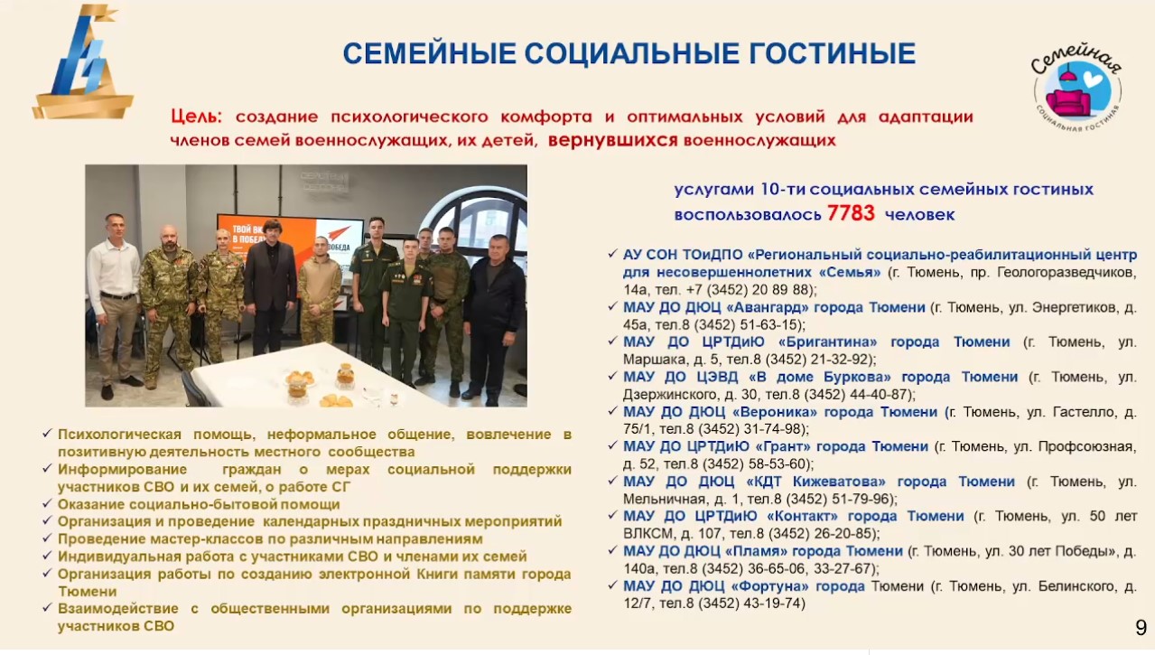 Связующим звеном здесь выступают социальные гостиные (в Тюмени их 10), там можно получить помощь, поддержку, консультации. Здесь уже приняли более 7,7 тысячи запросов. Семьи также получают помощь в бытовых вопросах: перекопать огород, отремонтировать крышу