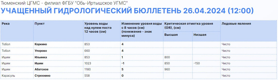 По данным на 12 часов 26 апреля уровень реки Ишим в городе составляет 1023 см, в Ильинке — 853 см, в Абатском — 1180 см.