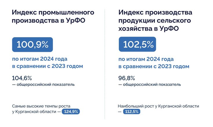 Индекс промышленного производства в УрФО по итогам 2024 года в сравнении с 2023 годом составил 100,9%, общероссийский показатель — 104,6%. Самые высокие темпы роста продемонстрировала Курганская область — 124,9%, регион занял первое место в стране по росту индекса промышленного производства.