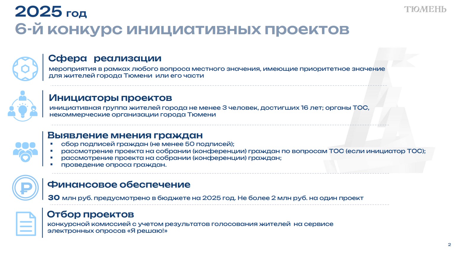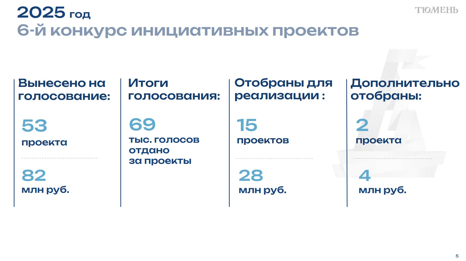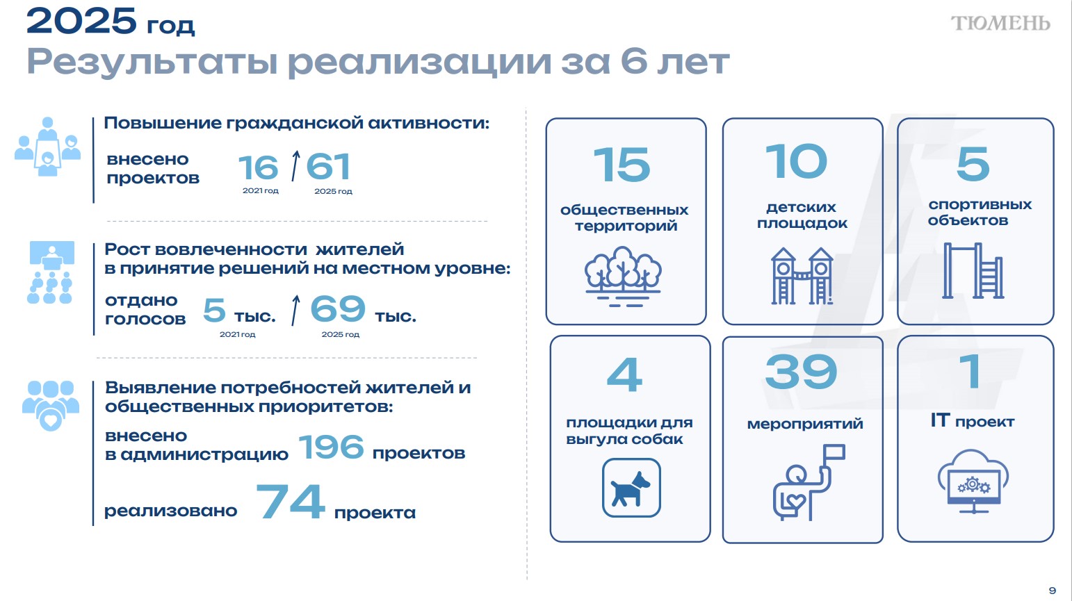 Артем Катренко, заместитель главы Тюмени, директор городского департамента финансов и налоговой политики, сообщил, что бюджет каждого проекта, по условиям, не должен превышать 2 млн рублей. Из 61 внесенного в 2025 году проекта основная часть — 32 — спортивные, культурные, досуговые мероприятия. 13 касались вопросов благоустройства, устройства детских, спортивных площадок, площадок для выгула домашних животных и др. Год назад было отобрано 15 проектов, еще два — реализовано дополнительно, за счет сложившейся экономии.
