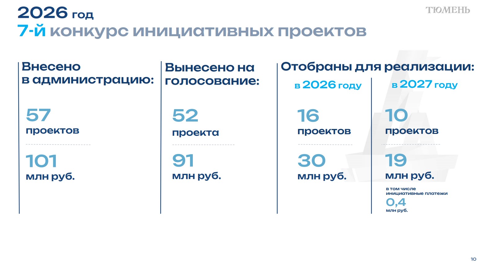 Из внесенных нынче проектов 16 будет реализовано в 2026 году, 10 — в 2027 году. Общая сумма финансирования составит 49 млн рублей.