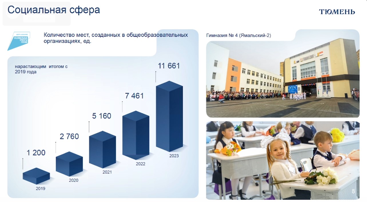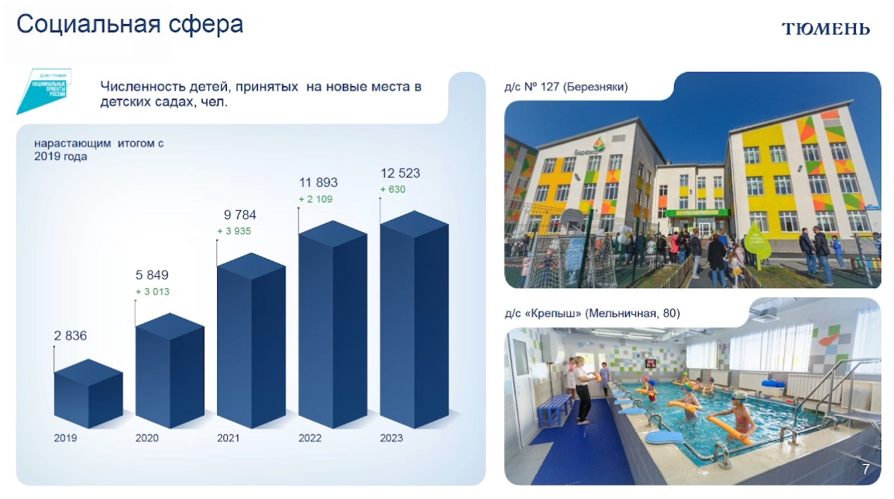 В Тюмени продолжается демографический естественный и миграционный прирост. Начиная с 2019 года в детских садах создано более 12,5 тысячи мест, в школах — более 11,6 тысячи мест, в том числе 4,2 тысячи в 2023 году.