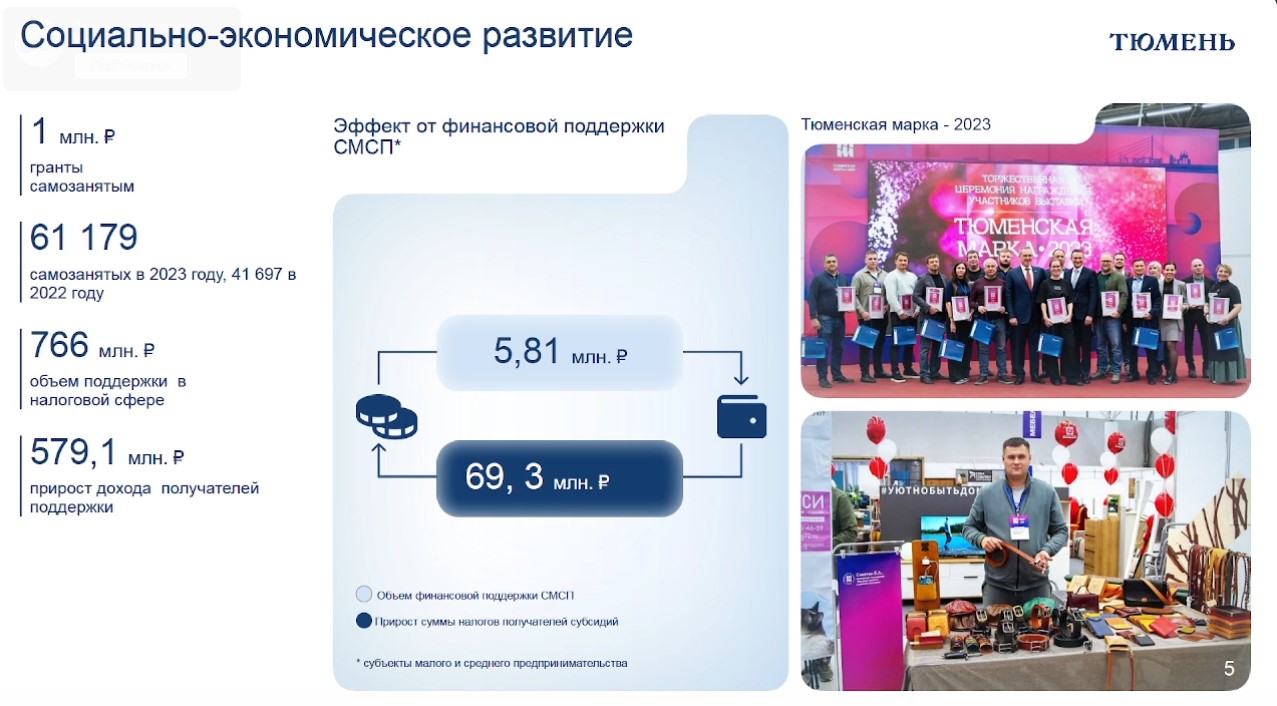 Объем отгруженных товаров собственного производства оценен в 451,9 млрд рублей; инвестиций — 1,9 млрд рублей; розничного товарооборота — 374,2 млрд рублей. Предприниматели-получатели поддержки показали прирост дохода 579,1 млн, налогов — 69,3 млн рублей.