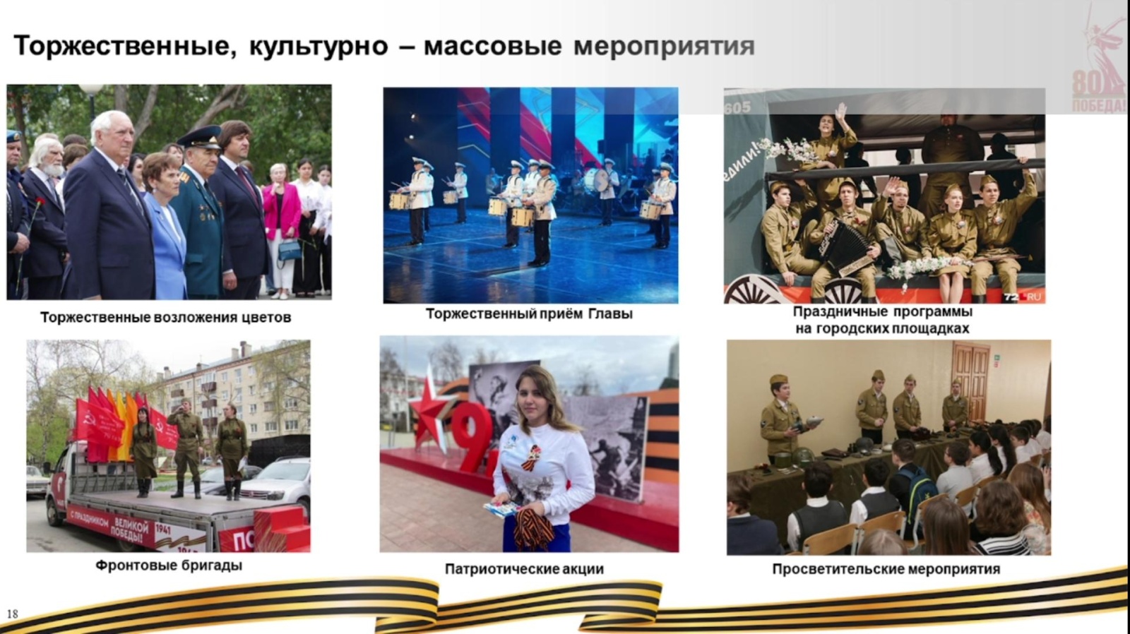 Заместитель главы города Дина Горковец сообщила, что планируется более 130 мероприятий. Для сравнения: год назад их было около 40. При этом есть отдельный план по празднованию Года Героев в Тюменской области.Кроме культурно-массовых и спортивных событий запланирован блок вопросов по поддержке ветеранов. 23 участника Великой Отечественной войны получили звание Почётных граждан Тюмени. 810 ветеранов — юбилейные медали.