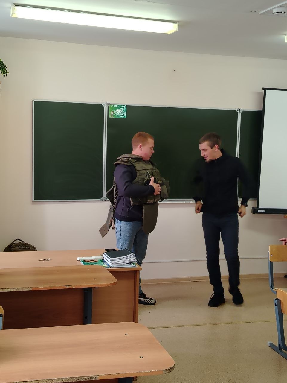 Интерактивная часть урока, где студенты смогли примерить бронежилет и на себе оценить тяжесть армейской экипировки, стала мощным практическим дополнением к искреннему разговору.