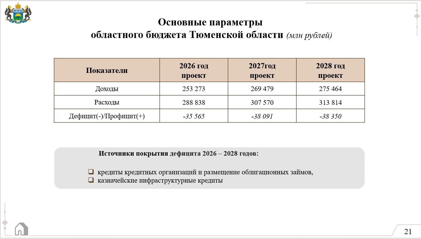 В целом расходы региона на следующий год планируются в размере 288 млрд 838 млн рублей, доходы — 253 млрд 273 млн руб. Дефицит в 35 млрд 565 млн планируется покрыть за счет инфраструктурных кредитов, либо кредитов в кредитных организациях, размещения облигационных займов.
