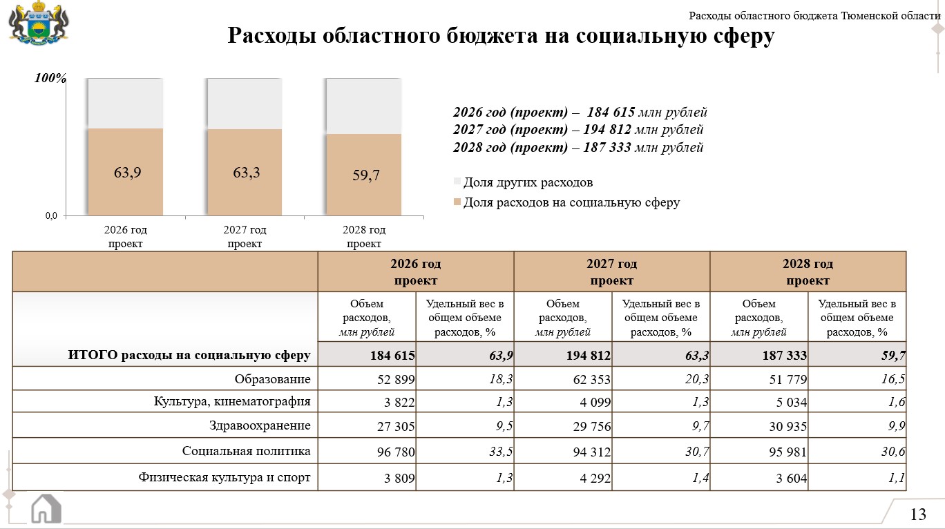 Отметим, что в 2026 году доля расходов областного бюджета на социальную сферу составит 63,9% - 184 млрд 615 млн рублей. В том числе на образование — 52 млрд 899 млн рублей (18,3%).