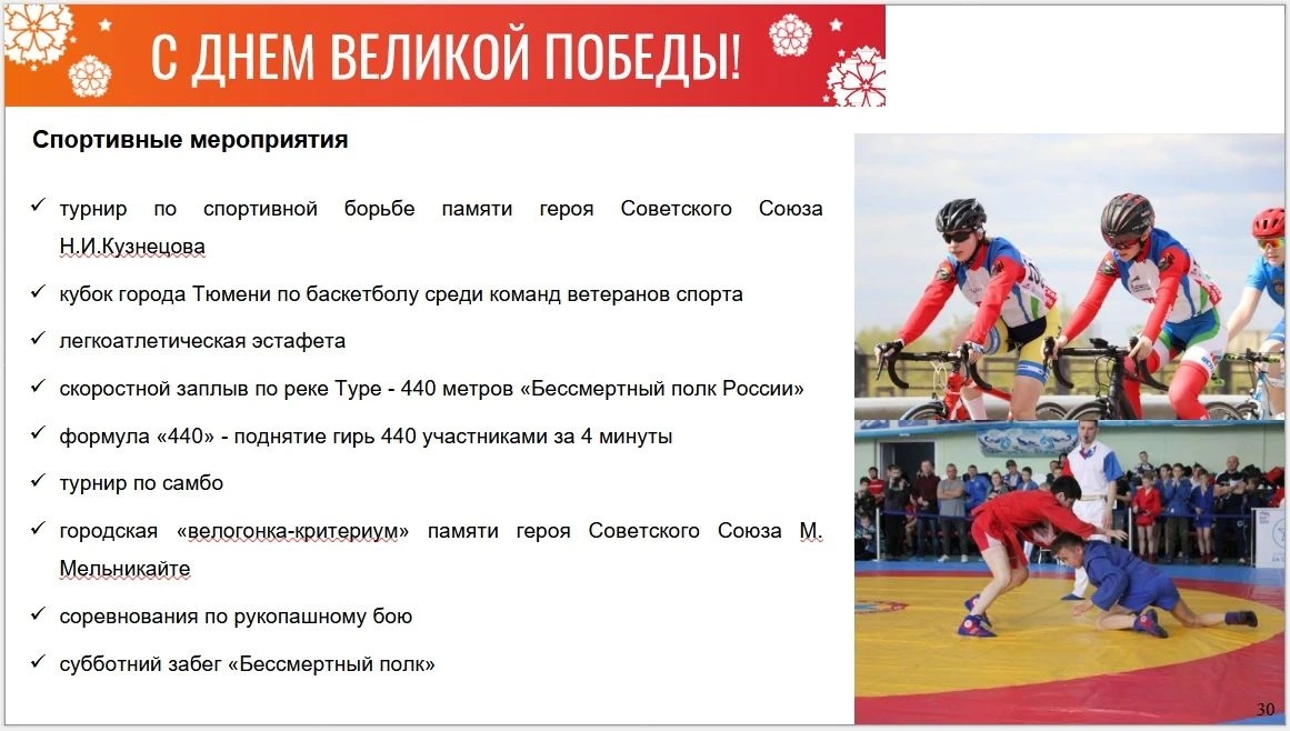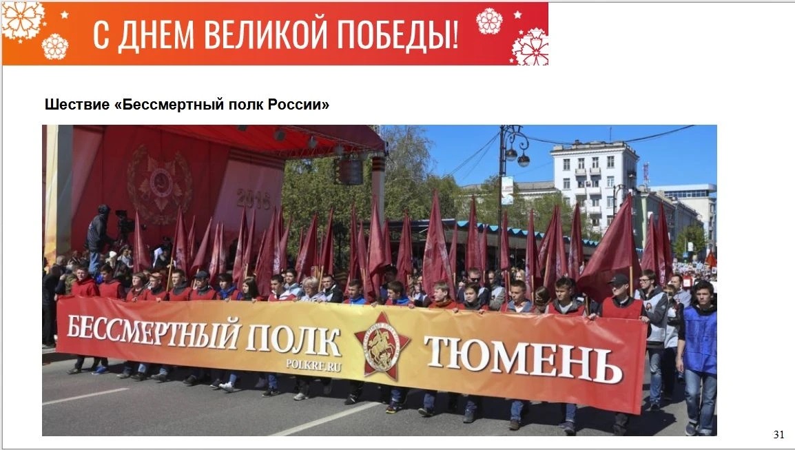 Особое внимание уделяется подготовке к шествию «Бессмертный полк», которое ежегодно собирает тысячи тюменцев, желающих почтить память своих родных — участников Великой Отечественной войны. Также в городе пройдет забег «Бессмертный полк». Кроме того, запланировал скоростной заплыв «Бессмертного полка» по Туре: в юбилейный для Тюмени год дистанция составит 440 метров. Еще одна тематическая акция к юбилею: 440 участников четыре минуты будут поднимать гири.