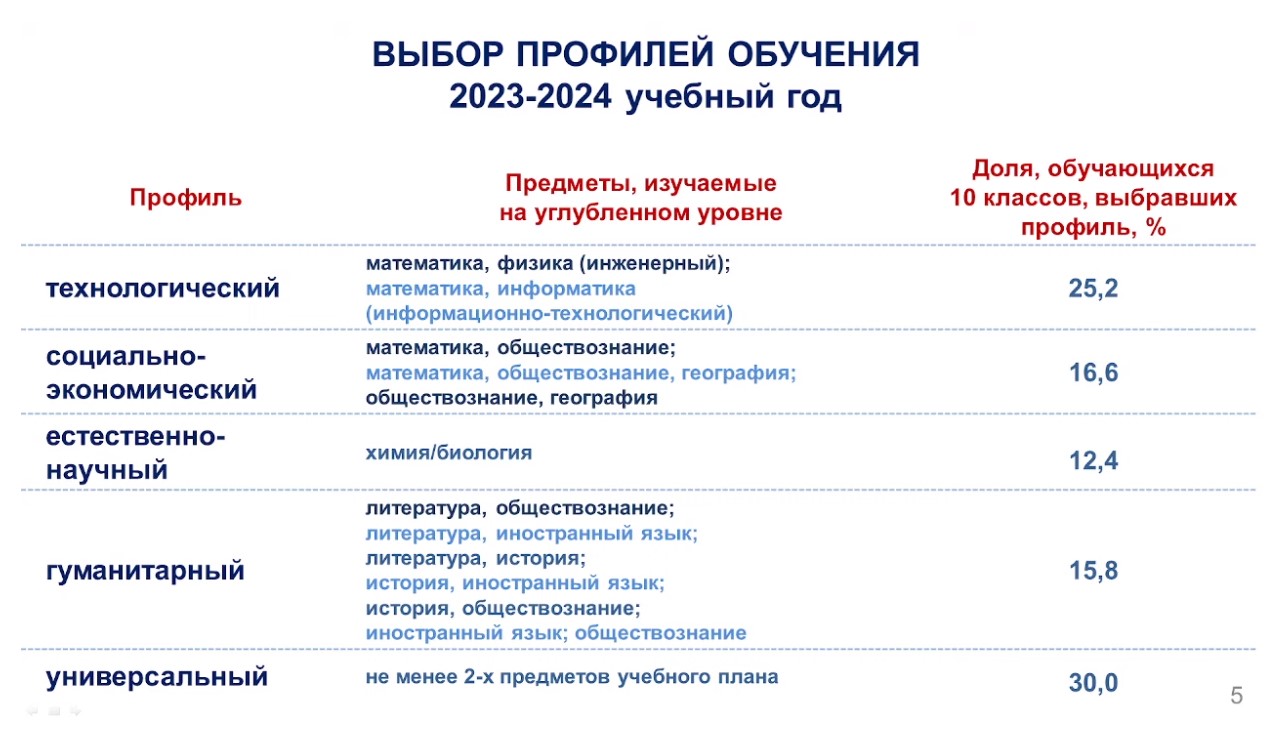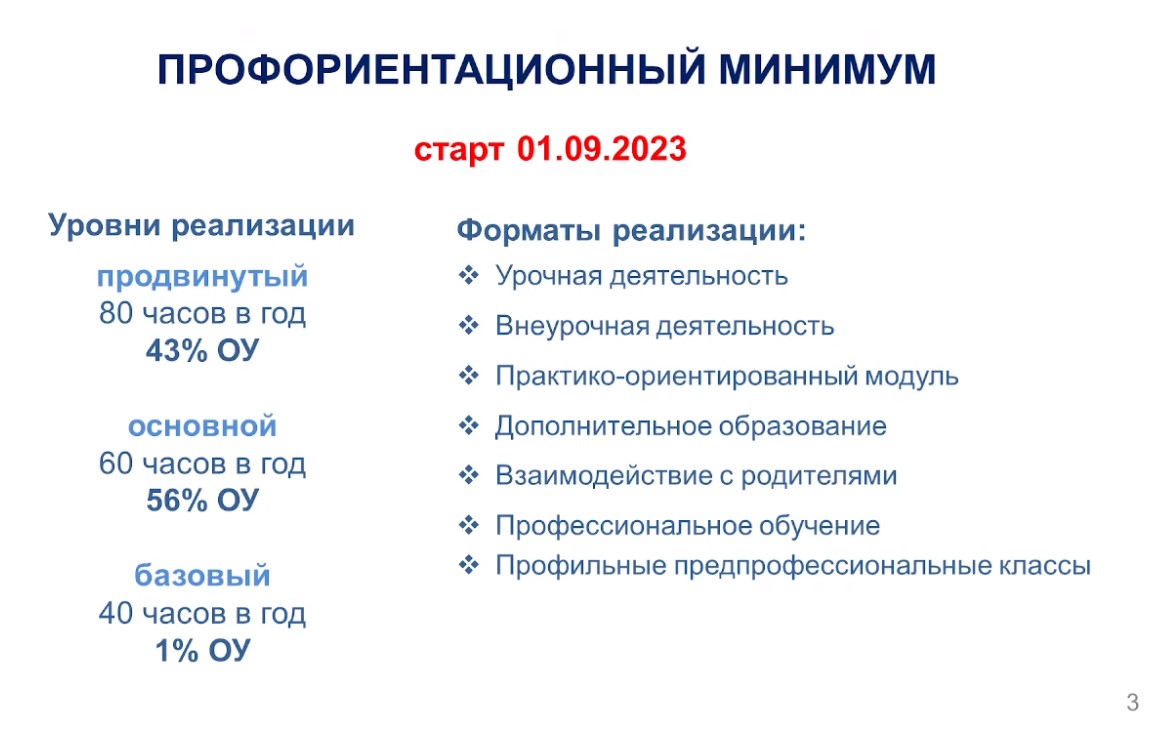 Заместитель главы города Дина Горковец сообщила, что с 1 сентября 2023 года введен профориентационный минимум. 100% обучающихся 10-11 классов осваивают программы профильного обучения. В соответствии с ФГОС, 10-классники изучают не менее двух учебных предметов на углубленном уровне. 66% общеобразовательных организаций имеют отраслевые и корпоративные классы.
