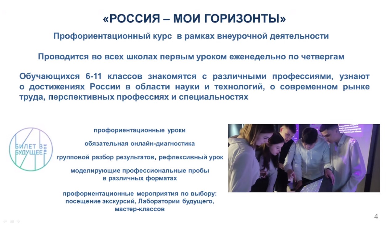 Профориентация начинается уже с 5 класса. В частности, она проводится на четверговых уроках в рамках проекта «Россия — мои горизонты». Внедрен проект «Первая профессия», работа проводится и в рамках дополнительного образования.