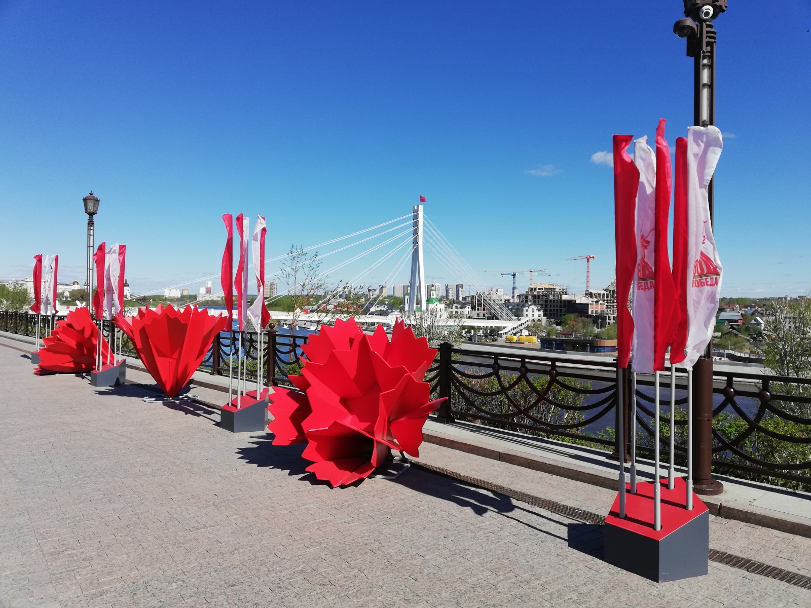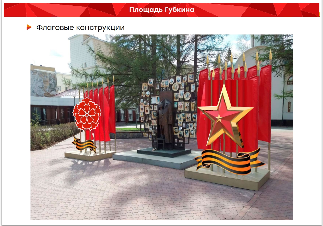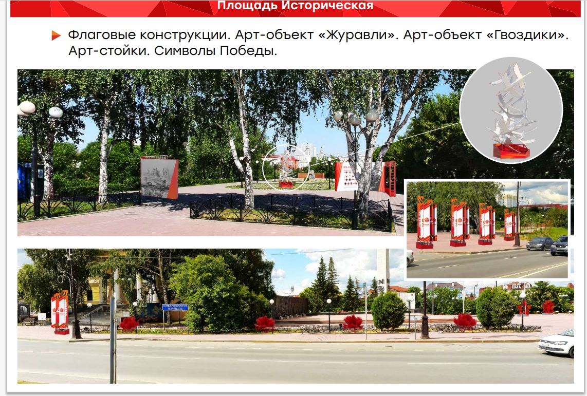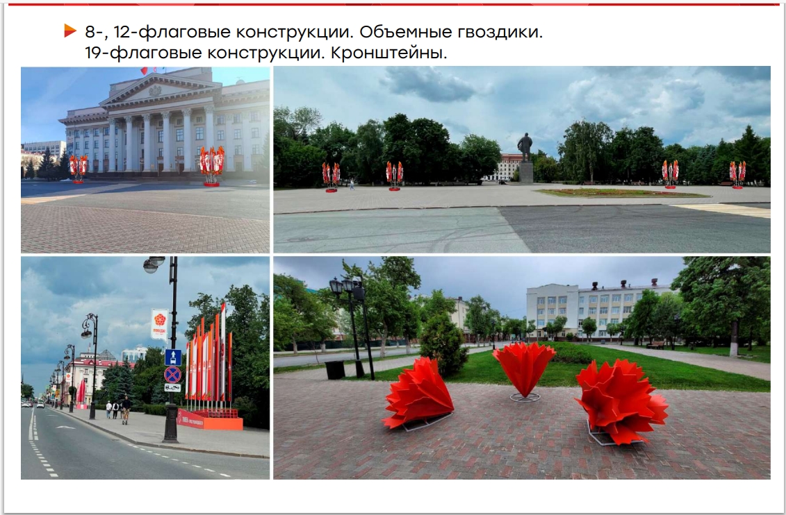 На улицах появятся перетяжки, флаговые конструкции, объемные гвоздики, кронштейны, арт-объекты «Журавли» и др.