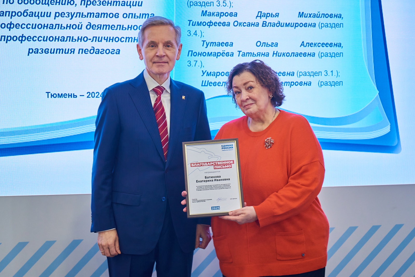 Благодарности «Единой России» и памятные подарки из рук Андрея Артюхова получили Екатерина Батюкова, Ирина Зейтунян, Любовь Ермишина, Валерия Магомедова и другие авторы, внесшие значительный вклад в разработку издания. Секретарь Тюменского реготделения партии напомнил, что 2025 год является годом юбилея Петра Павловича Ершова, и призвал сотрудников школ и детсадов поучаствовать в праздновании этой важной даты.