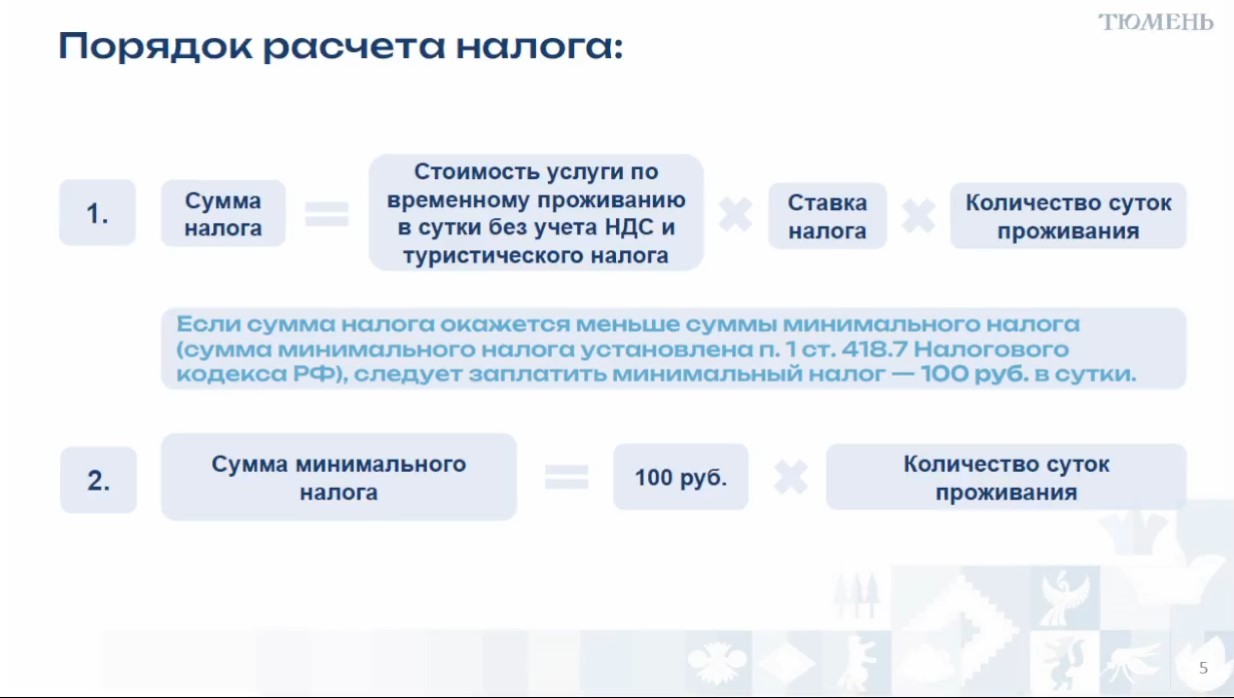 В 2026 году налоговая ставка составит 2%. Далее будет прибавляться по проценту, и к 2029 году она составит 5%. Налог будут платить организации и предприниматели, которые оказывают услуги временного проживания. Расчет будет производиться, исходя из стоимости услуг без НДС. Минимальная сумма составит 100 рублей.