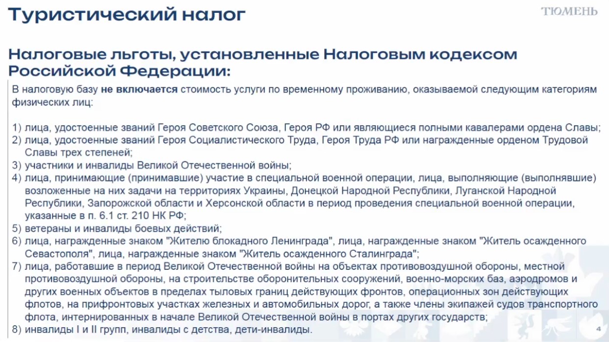 В конечном счете налог будут платить туристы, так как его включат в стоимость услуги. При этом от уплаты будут освобождены граждане ряда категорий, в том числе ветераны и инвалиды боевых действий, Великой Отечественной войны, участники СВО, инвалиды 1 и 2 групп и др.