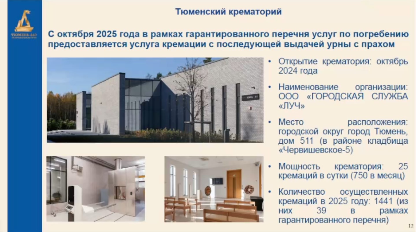 Первый тюменский крематорий был открыт в октябре 2024 года. В 2025 году проведена 1441 кремация, в том числе 39 — в рамках гарантированного перечня услуг. Это стало возможным с октября 2025 года. Такие итоги сообщил на заседании в гордуме Александр Ильин, заместитель главы города.