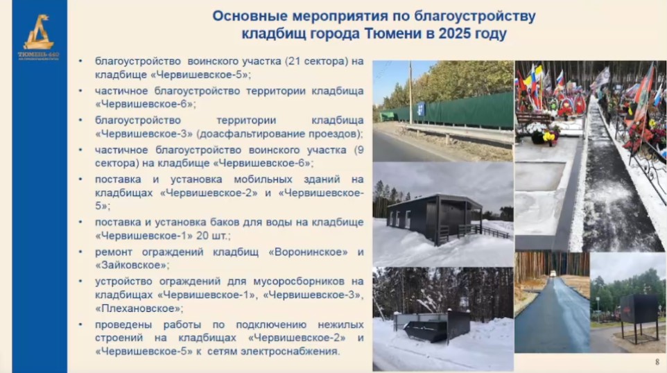 Отметим, что в Тюмени 11 кладбищ: семь православных и четыре мусульманских. В 2025 году, в частности, проводилось благоустройство воинских участков на кладбищах Червишевское-5 и 6, доасфальтирование на Червишевском-3, ремонт ограждения у Воронинского и Зайковского.