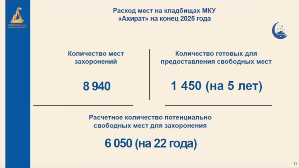 Отметим, что на кладбищах МКУ «Ахират» на конец 2025 года было более 8,9 тысячи захоронений. Без малого 1,5 тыс. мест — на ближайшие пять лет, более 6 тыс. — с перспективой на 22 года.