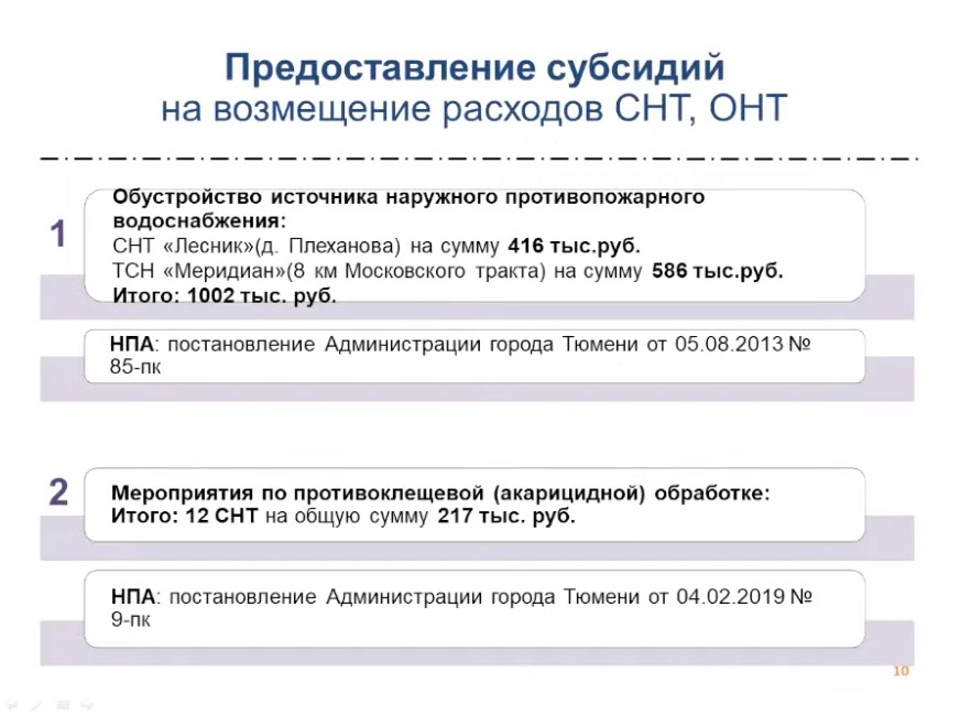 12 СНТ получили субсидии на противоклещевую обработку общих территорий на сумму 217 тысяч рублей. Депутат Екатерина Вешкурцева считает, что это мало. Директор департамента потребительского рынка Елена Еремина объяснила статистику заявительным характером: не все председатели готовы собрать необходимые документы.