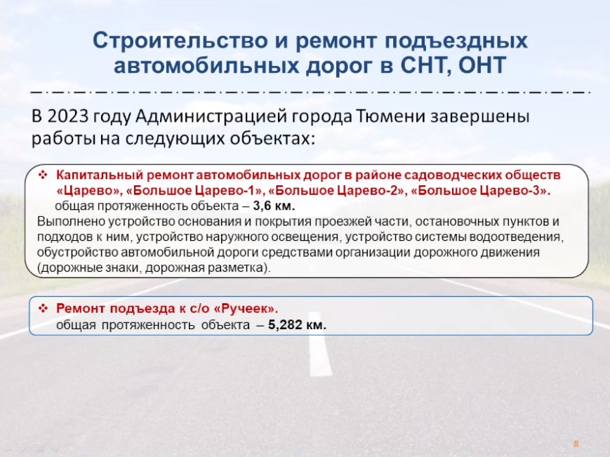 К сообществам обеспечивают подъездные пути. В 2023 году закончен большой проект, капремонт проведен на 3,6 км по пути в сообщество «Царево», также отремонтирован подъезд к «Ручейку» (5,3 км). 53 автобусных маршрута обслуживают товарищеские сообщества, в том числе 35 — зимой.