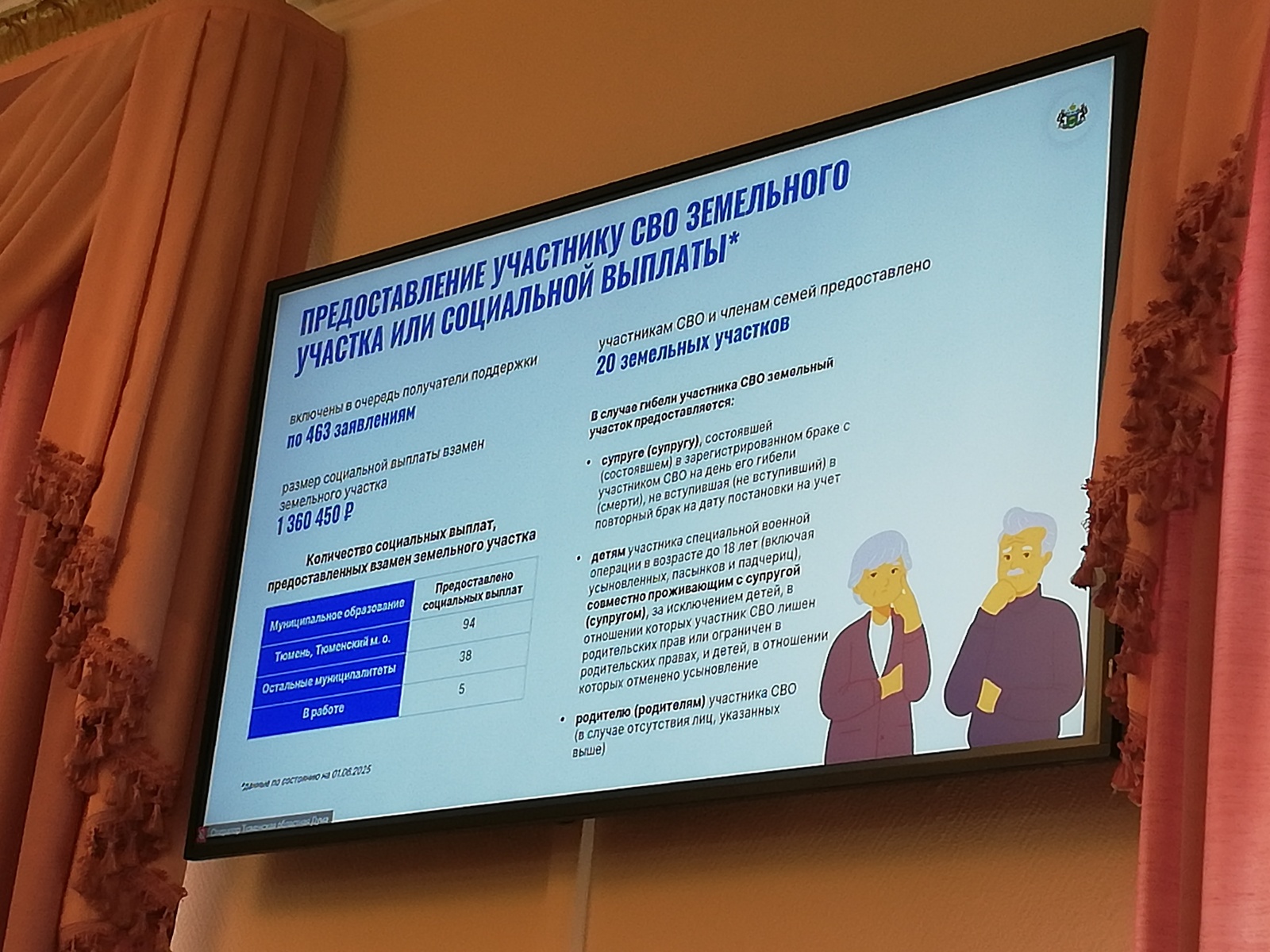 Андрей Киселев, заместитель губернатора, директор департамента имущественных отношений Тюменской области, сообщил, что положительные решения приняты по 463 заявлениям. Участникам СВО и членам их семей предоставлено 20 участков. Размер социальной выплаты взамен участка — 1 млн 360 тыс. рублей, один из самых высоких среди субъектов РФ. В Тюмени и Тюменском районе предоставлено 94 выплаты, в других муниципалитетах — 38. Еще пять заявлений находится в работе.