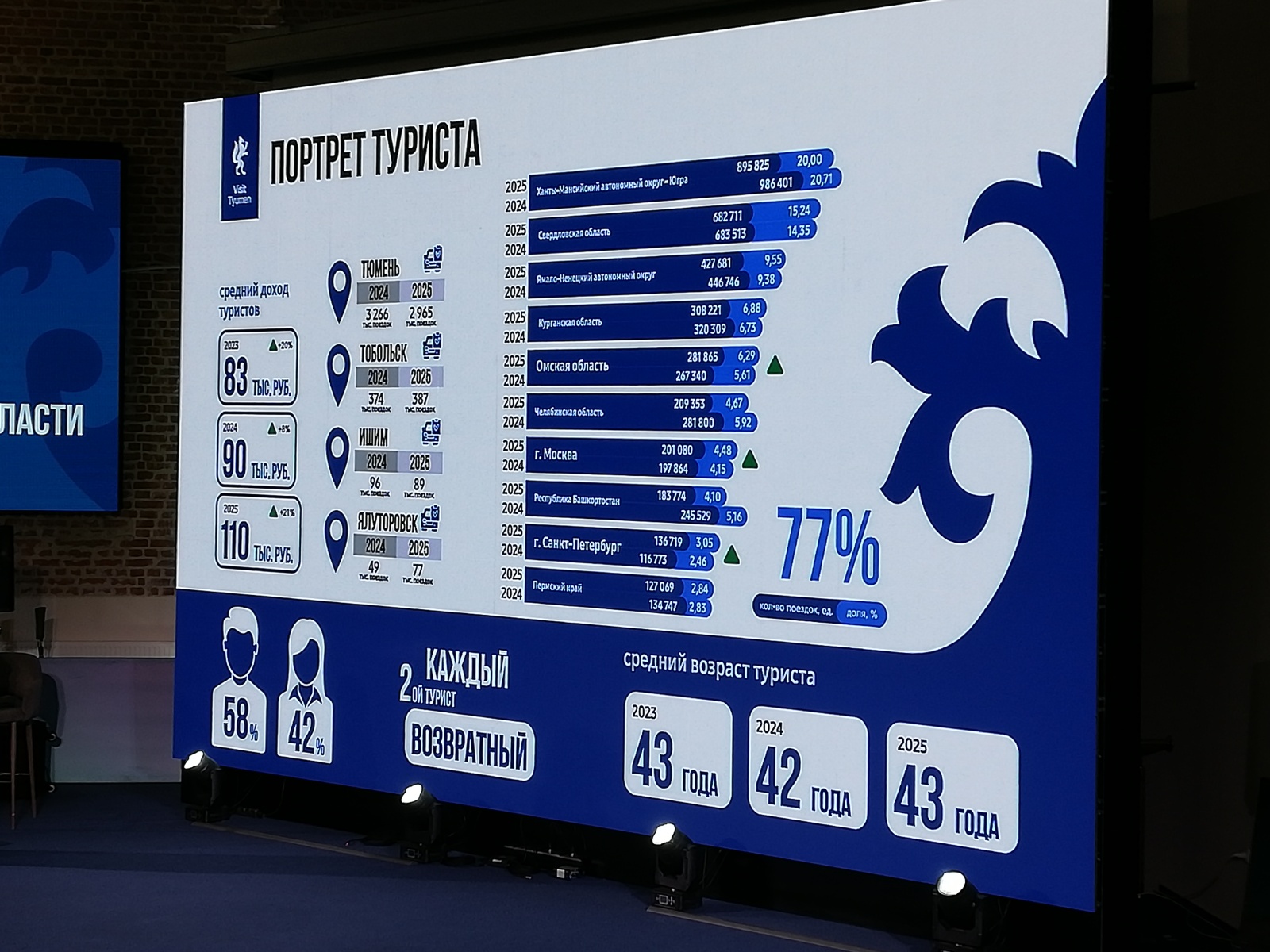 58% приезжих — мужчины. В 2025 году средний возраст приезжающих составил 43 года. Средний доход туриста — 110 тысяч рублей (в 2024 году было 90 тысяч).