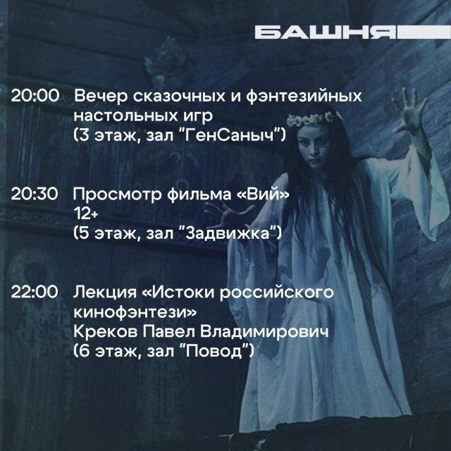 Участники от 12 лет смогут попасть на тематический вечер настольных игр и просмотр фильма «Вий» 1967 года. Они начнутся в 20.00 и 20.30 соответственно.