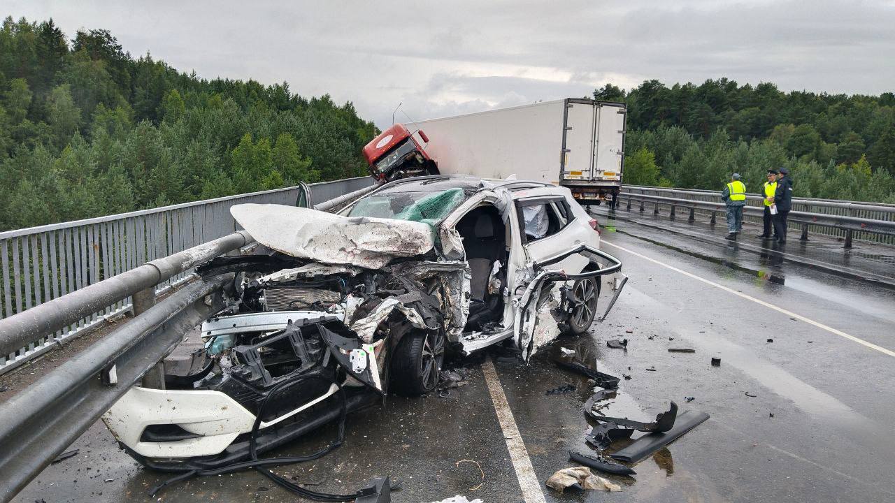По предварительным данным, 35-летний водитель большегруза «Фредлайнер» не учел скорость движения и безопасную дистанцию, при торможении выехал на встречную полосу, где столкнулся с автомобилем «Ниссан Кашкай».