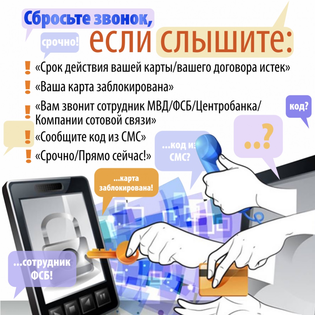 Также специалисты сообщили, в каких случаях стоит прекратить звонок. Если собеседник говорит: «Срок действия карты или договора истек», «Ваша карта заблокирована», «Сообщите код из смс», «Срочно! Прямо сейчас!», «Вам звонит сотрудник Банка России»