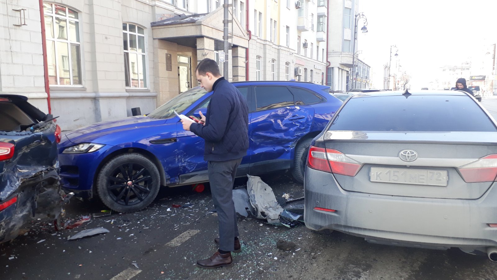 Сегодня около 12 часов 20 минут множество прохожих в районе магазина «Оптика» по ул. Республики, 48 стали свидетелями ДТП сразу тех автомашин: «Тойота Королла» столкнулась с двумя кроссоверами — «КИА» и «Ягуар». Все машины получили механические повреждения. Один из паркетников от удара вылетел на тротуар. Но больше всех досталось «Тойоте». У нее завернуло вверх капот и сместило двигатель.