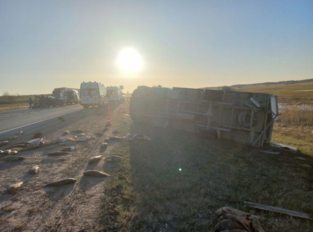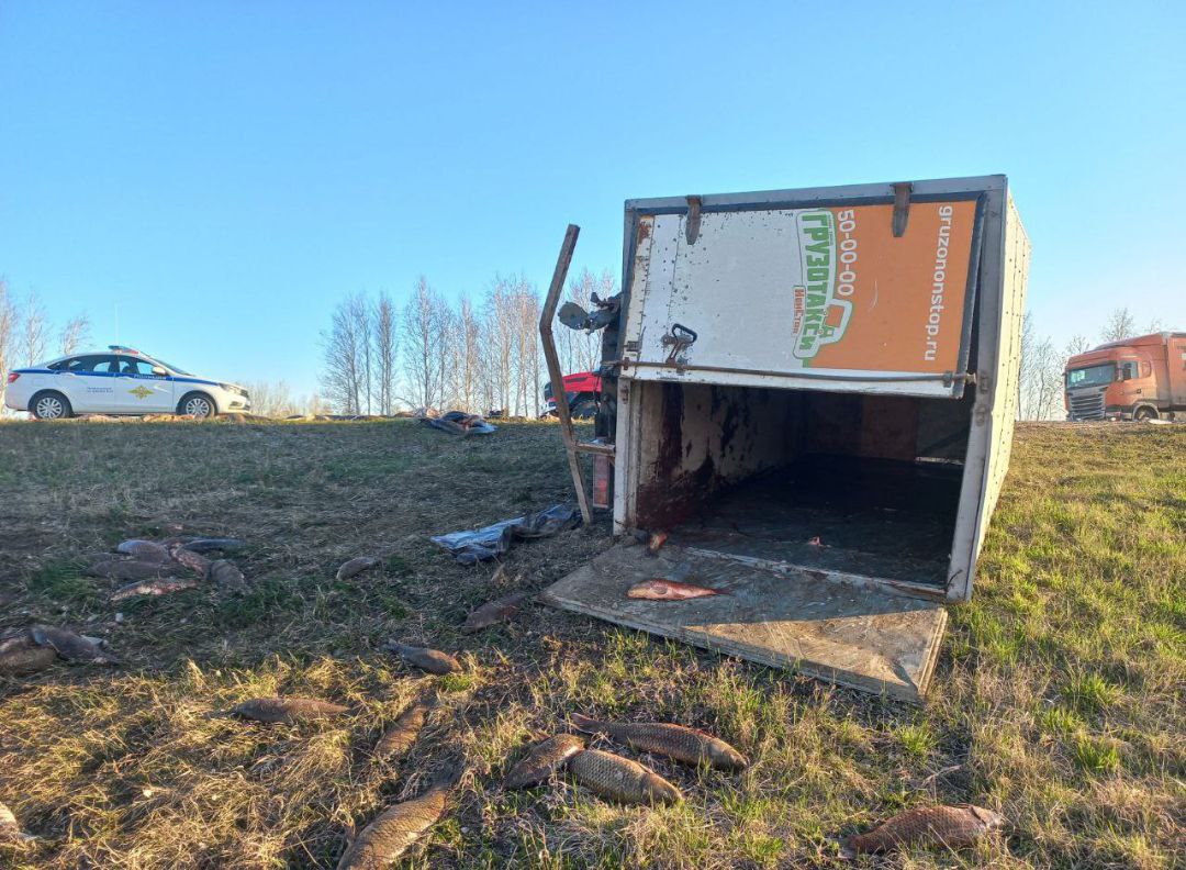 После столкновения «Газель» съехала с дороги и опрокинулась на бок. Судя по логотипу, фургон задействован в грузоперевозках, рядом с открывшимся кузовом по траве разбросана рыба.