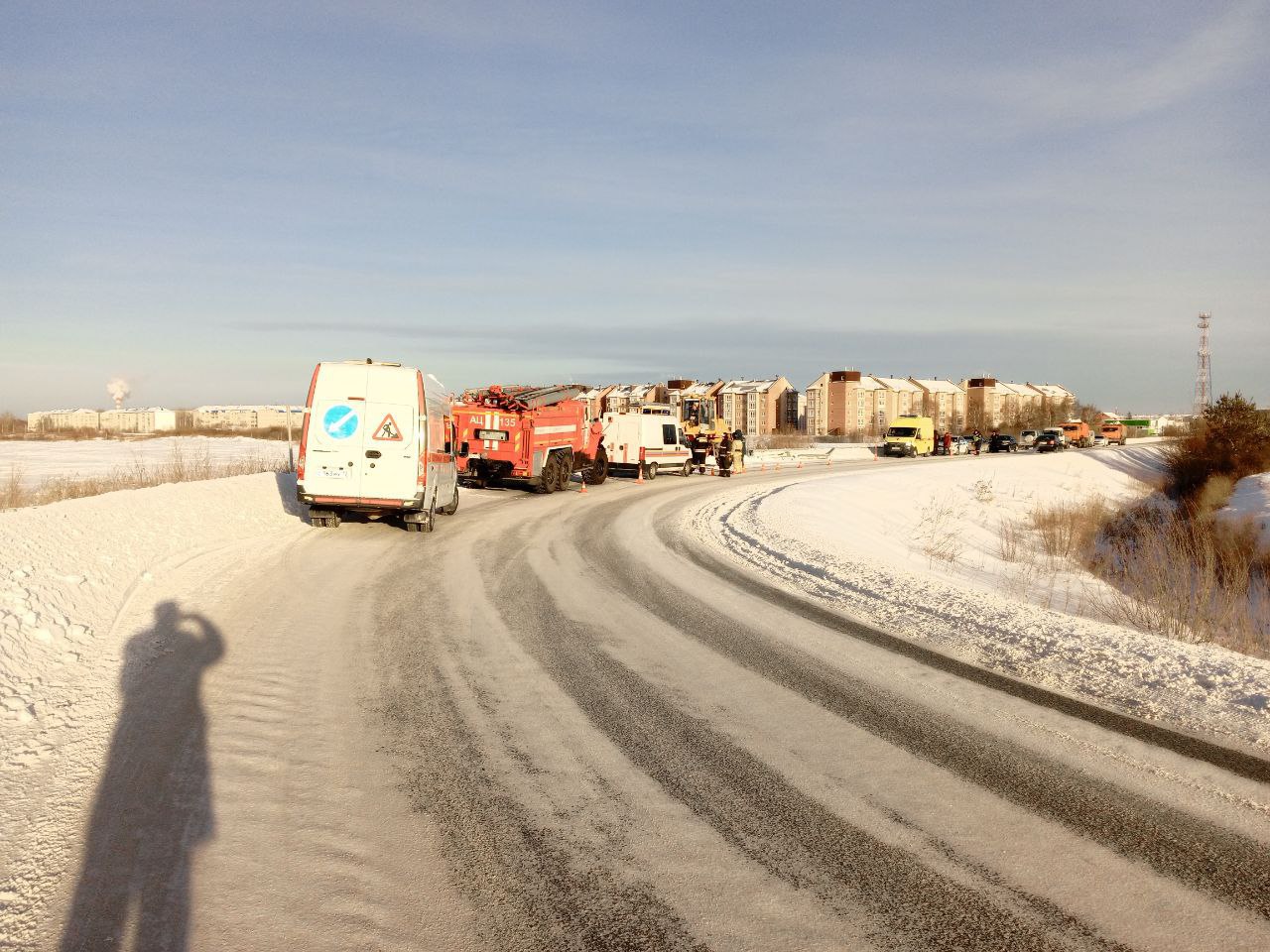Сейчас сотрудники экстренных служб пытаются поднять грузовик, чтобы извлечь погибшего человека из легкового автомобиля.