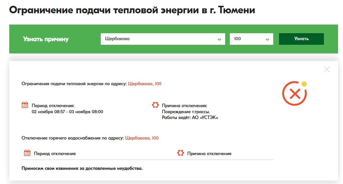 На сайте УСТЭК указано, что произошло повреждение теплотрассы, специалисты работают. Устранение предположительно займет почти сутки. Специалисты должны уложиться в срок до восьми утра 3 ноября (по факту обычно это происходит быстрее). Подача тепловой энергии отсутствует в домах №98, 104, 106, 110, 112, 114 на улице Щербакова. Узнать об отключениях и причинах ограничения ресурса можно на сайте ao-ustek.ru.