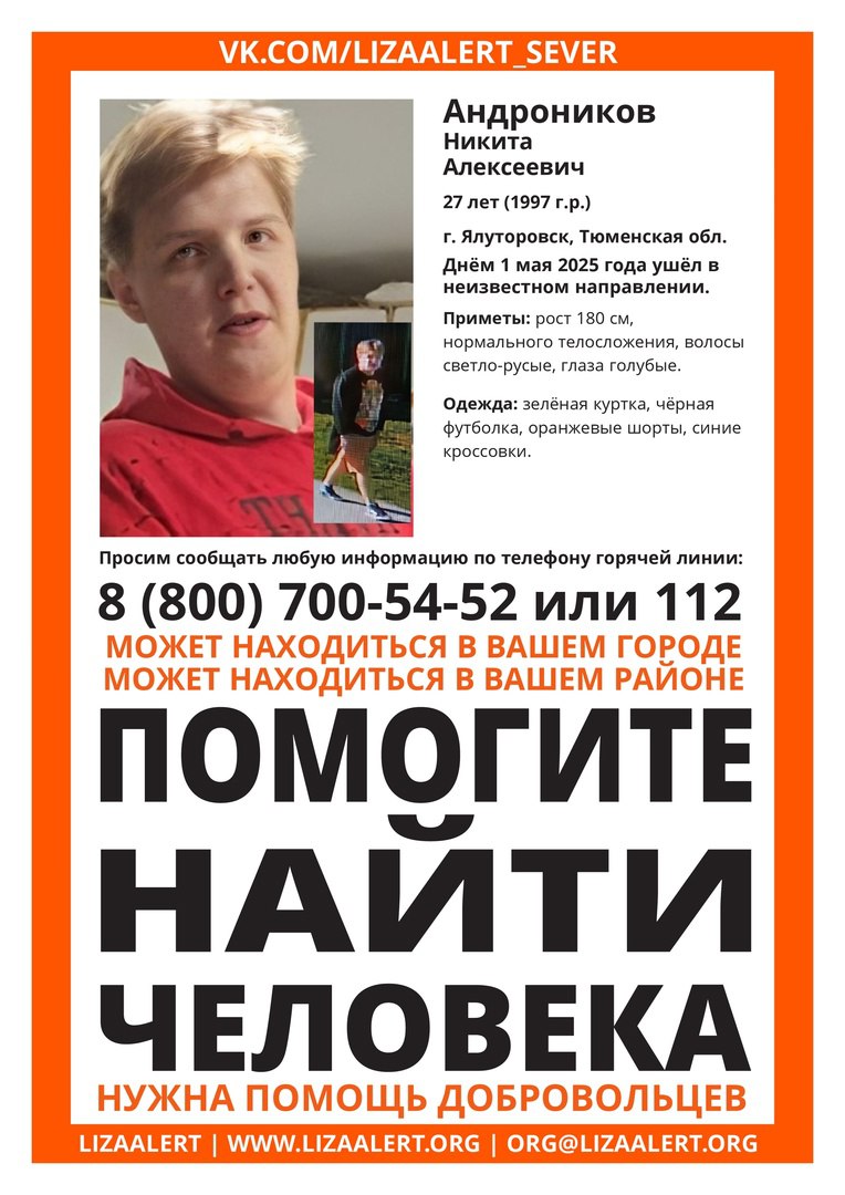 В Ялуторовске завершены поиски молодого Никиты Андроникова, который пропал 1 мая.
