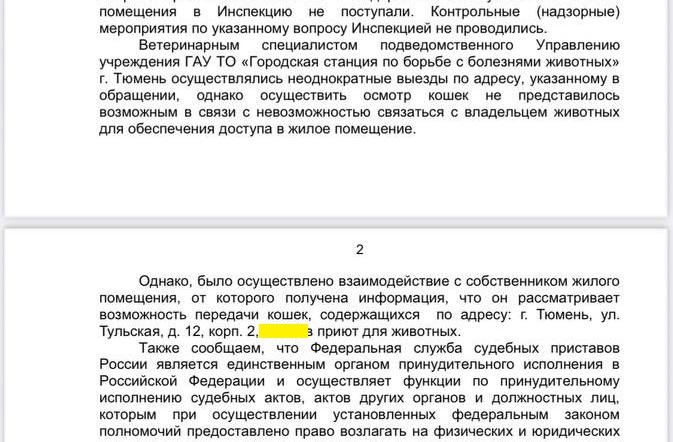 Он рассказал, что сам провел экспертизу и получил заключение Санэпидемстанции о превышении содержания в воздухе аммиака. Также жильцы дома на Тульской обращались в прокуратуру Ленинского округа. Там отчитались, что специалисты «Городской станции по борьбе с болезнями животных» неоднократно выезжали по адресу квартиры, однако не смогли осмотреть животных из-за того, что им не открыли, а с Натальей связаться не получилось. Однако они дозвонились до хозяйки квартиры Юлии П., и та пообещала, что рассматривает возможность передачи кошек в приют. Также жильцы обращались в управление Роспотребнадзора, но те ответили, что не рассматривают нарушения из-за запахов.